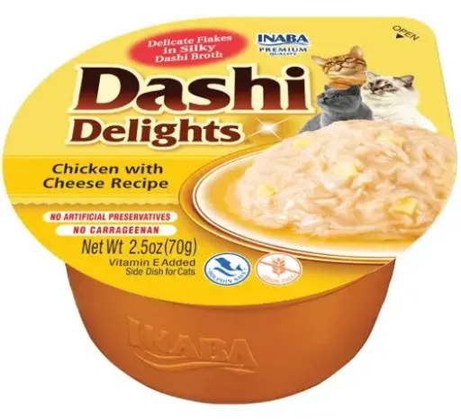 Surpreenda o seu gato com a comida húmida Dashi Delights da Inaba, feita com ingredientes saudáveis e confiáveis, como frango do campo, queijo e bonito natural.