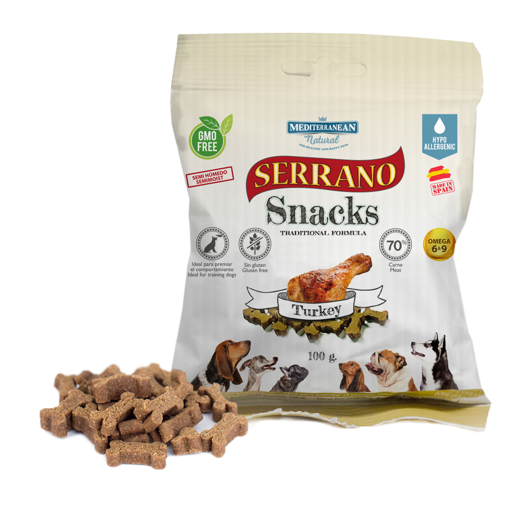 Os Snacks Serrano, cortados em pequenas quantidades com uma forma óssea, garantem a segurança do seu animal de estimação. Mantêm-se puros e todos os nutrientes, refletem a dieta natural. Contêm 70% de carne (60% em “Snacks Serrano para cachorros ”).